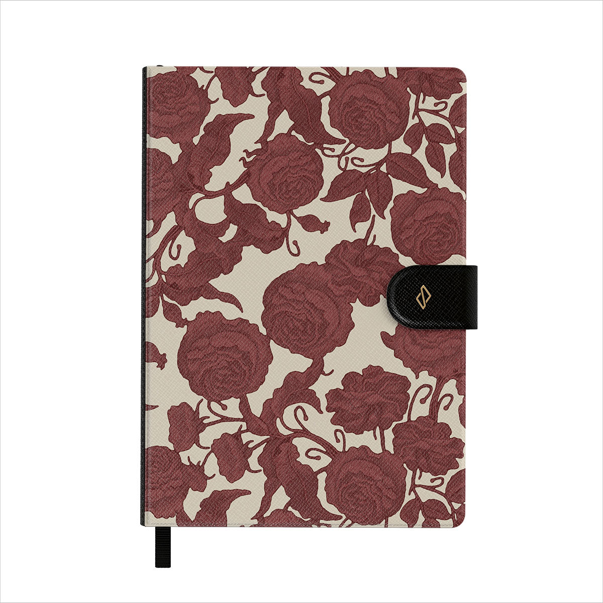 This design features: dark red roses, intricate floral pattern, vintage pattern