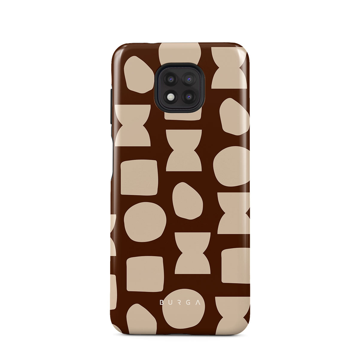 Our Terracotta Motorola Moto G Power 2021 phone case design whispers warmth and grounded energy. Against a rich brown background, an interplay of light shapes unfolds, captivating the eye with an array of circles, squares, and hourglasses. Each shape is a testament to the beauty found in simplicity.