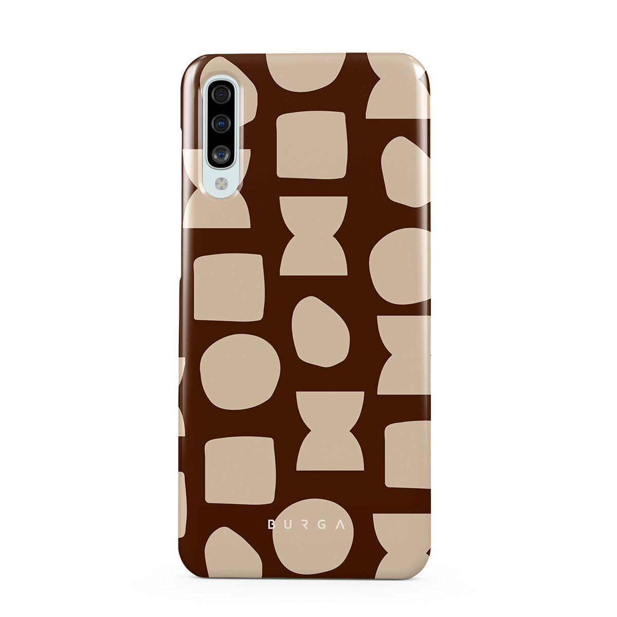 Our Terracotta Samsung Galaxy A50 phone case design whispers warmth and grounded energy. Against a rich brown background, an interplay of light shapes unfolds, captivating the eye with an array of circles, squares, and hourglasses. Each shape is a testament to the beauty found in simplicity.