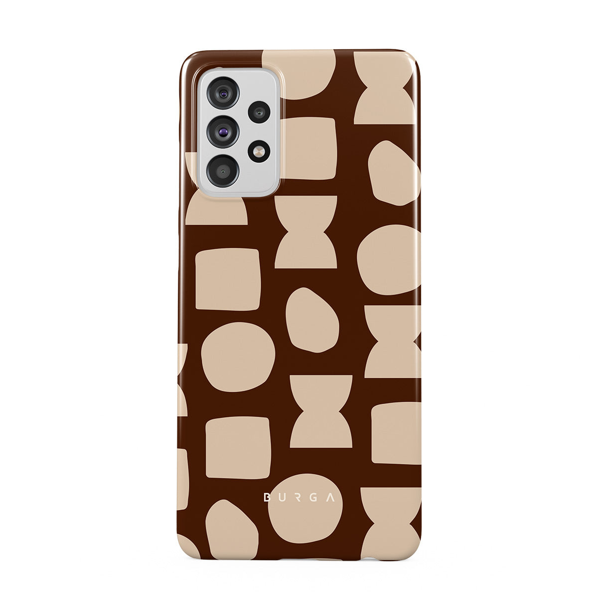 Our Terracotta Samsung Galaxy A72 4G / 5G phone case design whispers warmth and grounded energy. Against a rich brown background, an interplay of light shapes unfolds, captivating the eye with an array of circles, squares, and hourglasses. Each shape is a testament to the beauty found in simplicity.