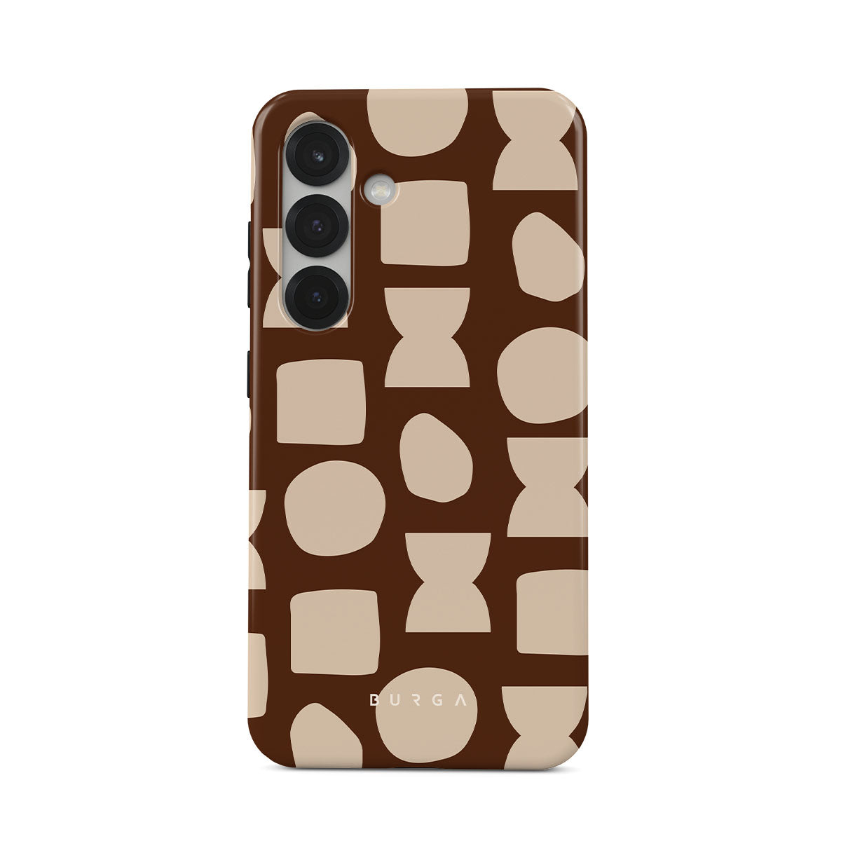 Our Terracotta Samsung Galaxy S25 phone case design whispers warmth and grounded energy. Against a rich brown background, an interplay of light shapes unfolds, captivating the eye with an array of circles, squares, and hourglasses. Each shape is a testament to the beauty found in simplicity.