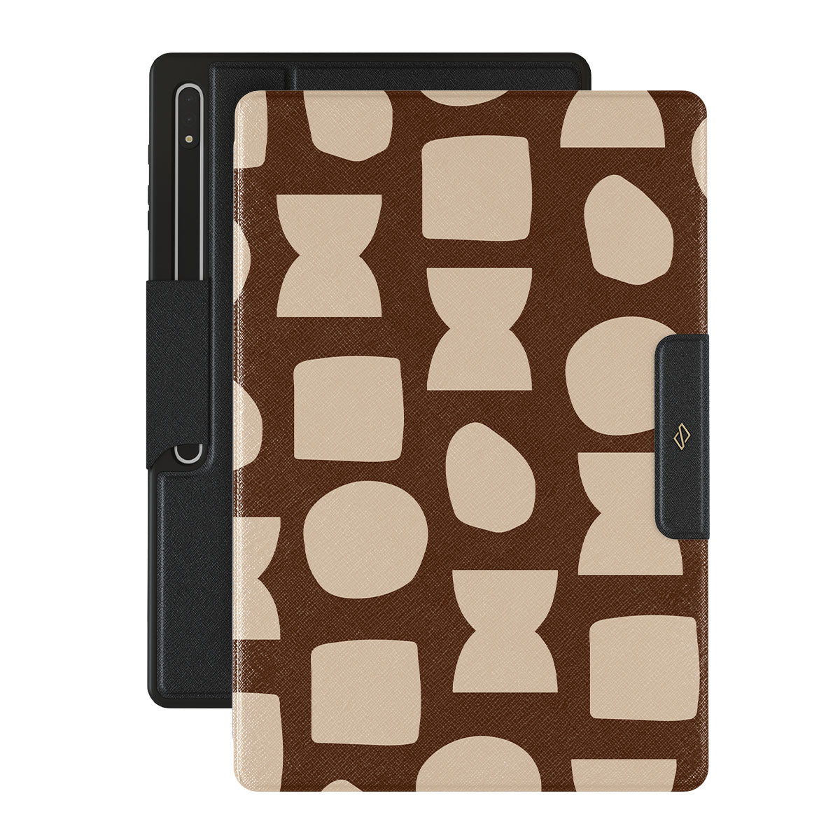 Our Terracotta Samsung Galaxy Tab S8 Ultra folio case design whispers warmth and grounded energy. Against a rich brown background, an interplay of light shapes unfolds, captivating the eye with an array of circles, squares, and hourglasses. Each shape is a testament to the beauty found in simplicity.