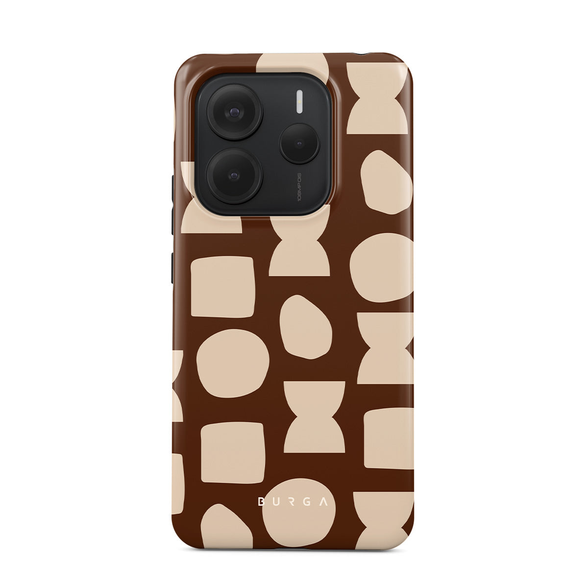Our Terracotta Xiaomi Redmi Note 14 5G phone case design whispers warmth and grounded energy. Against a rich brown background, an interplay of light shapes unfolds, captivating the eye with an array of circles, squares, and hourglasses. Each shape is a testament to the beauty found in simplicity.