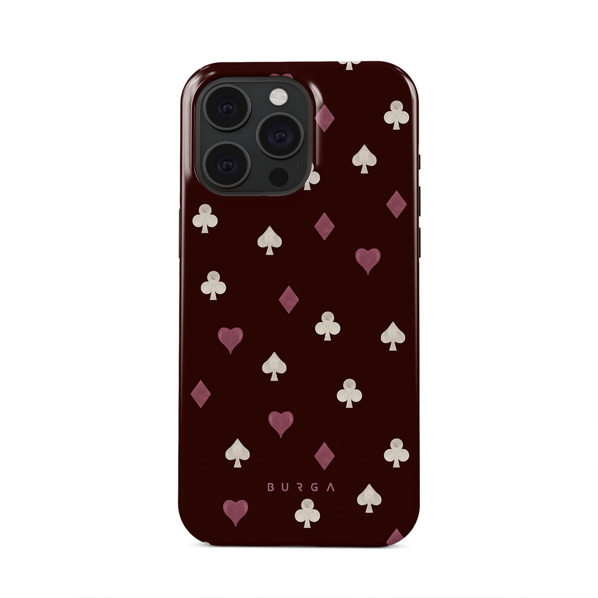 Nothing is as it appears. Hearts, clubs, diamonds, and spades—stacked in your favor or playing against you? This iPhone 15 Pro Max phone case design features a rich burgundy background and minimalist suits that make for a game where the rules are constantly shifting.