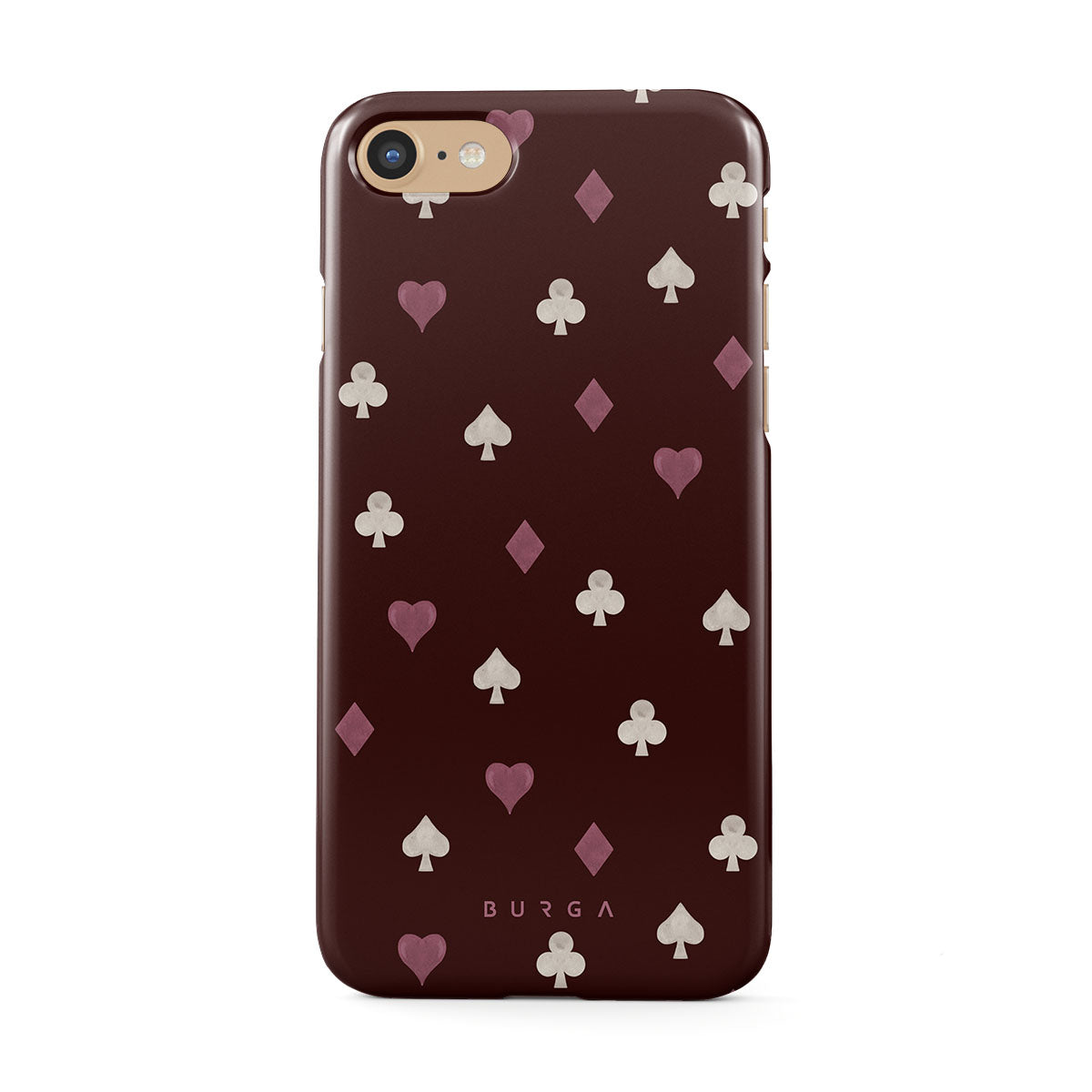 Nothing is as it appears. Hearts, clubs, diamonds, and spades—stacked in your favor or playing against you? This iPhone SE (2020) phone case design features a rich burgundy background and minimalist suits that make for a game where the rules are constantly shifting.