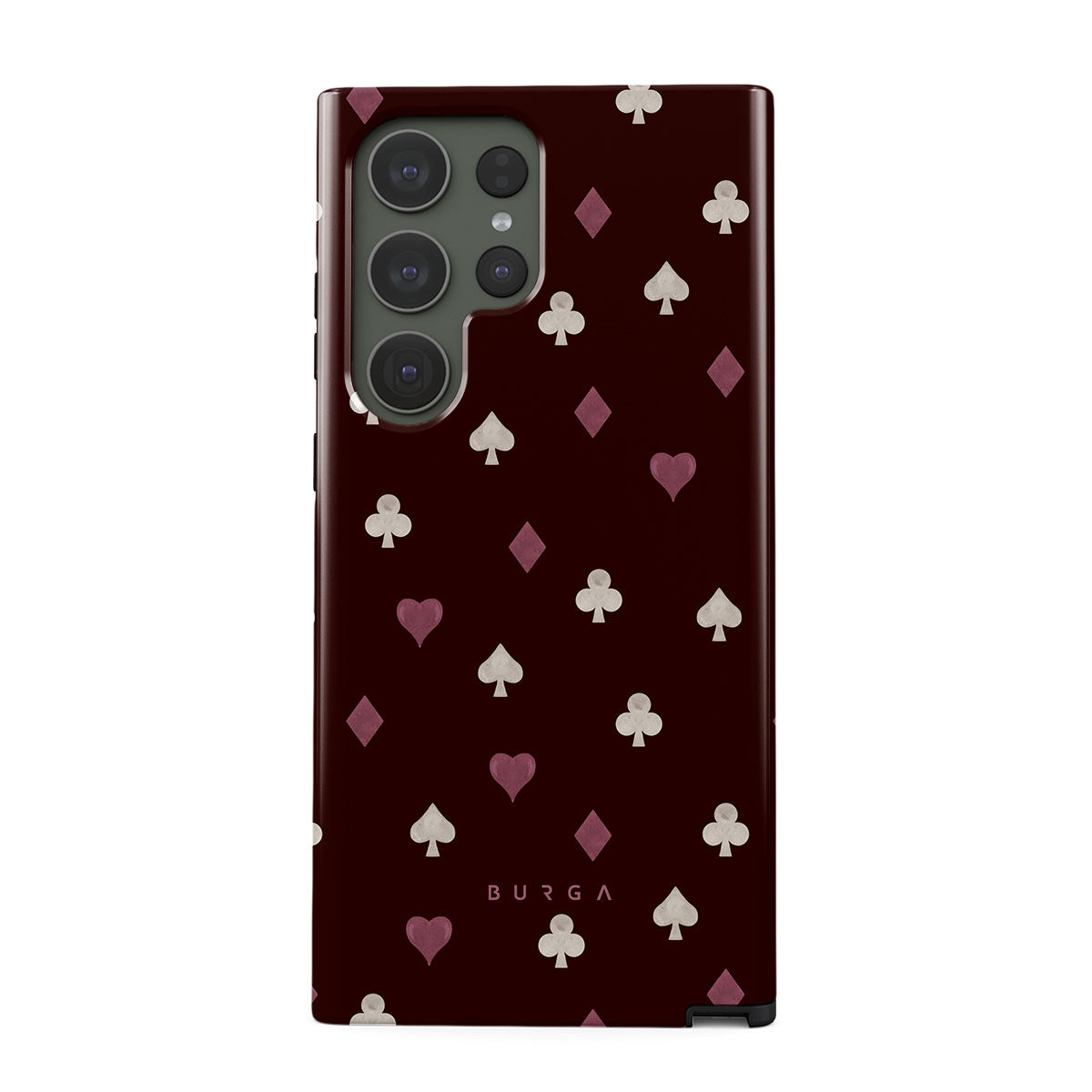 Nothing is as it appears. Hearts, clubs, diamonds, and spades—stacked in your favor or playing against you? This Samsung Galaxy S23 Ultra phone case design features a rich burgundy background and minimalist suits that make for a game where the rules are constantly shifting.