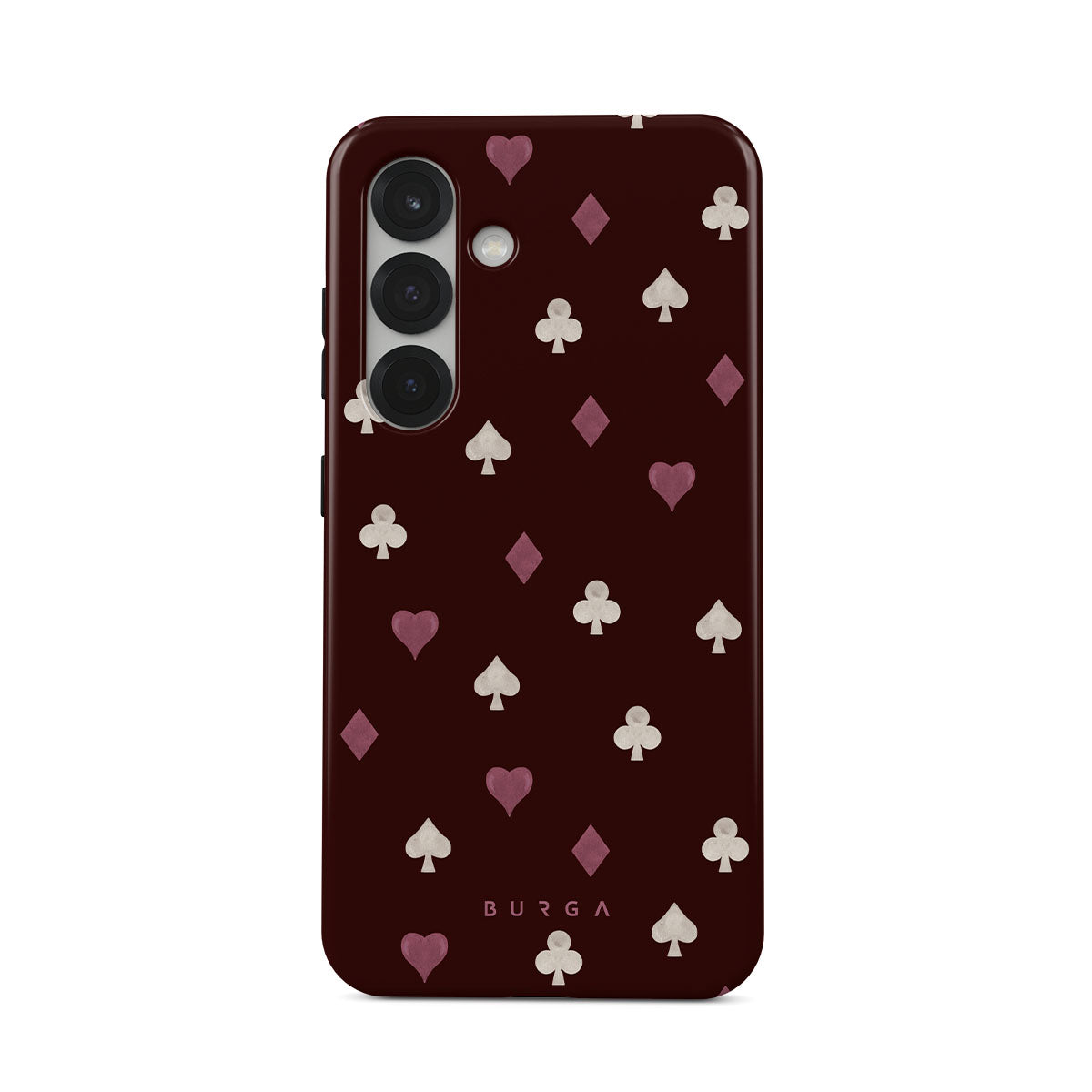 Nothing is as it appears. Hearts, clubs, diamonds, and spades—stacked in your favor or playing against you? This Samsung Galaxy S25 Plus phone case design features a rich burgundy background and minimalist suits that make for a game where the rules are constantly shifting.