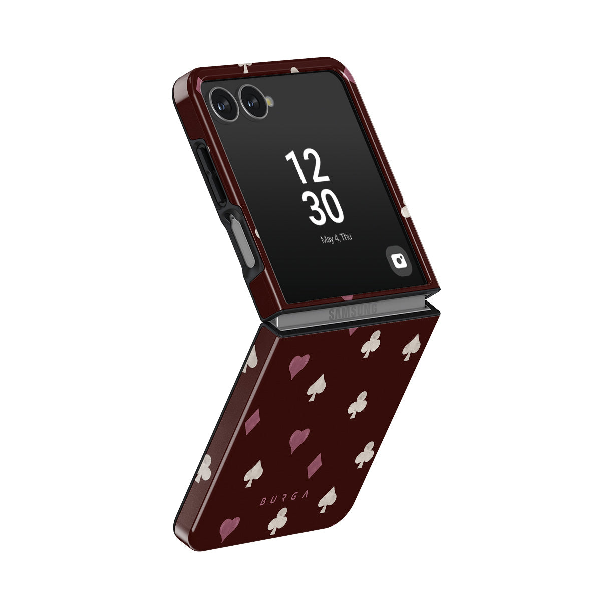 Nothing is as it appears. Hearts, clubs, diamonds, and spades—stacked in your favor or playing against you? This Samsung Galaxy Z Flip 7 phone case design features a rich burgundy background and minimalist suits that make for a game where the rules are constantly shifting.