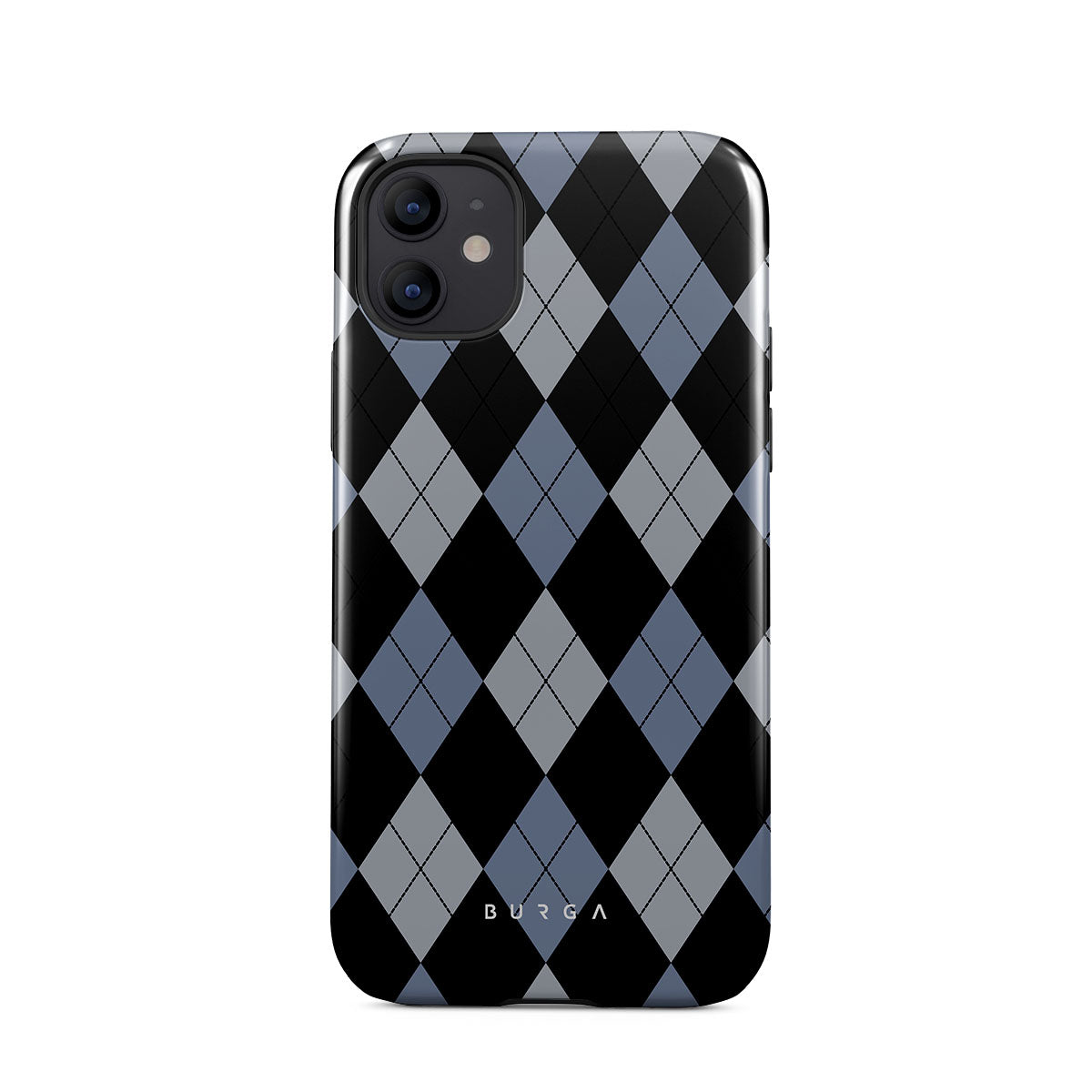 Discover our Trouble iPhone 12 phone case design—a classic argyle pattern featuring stark black diamonds that seamlessly blend with two distinct shades of blue. Made for those who respect the classics but aren't afraid to disrupt the norm.