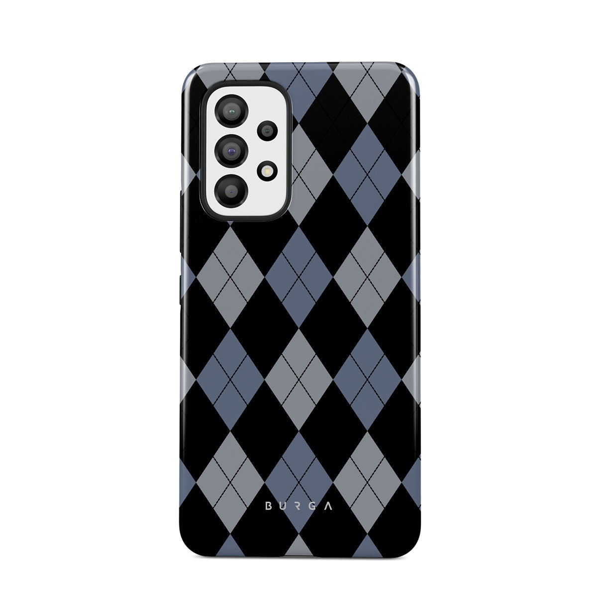 Discover our Trouble Samsung Galaxy A73 phone case design—a classic argyle pattern featuring stark black diamonds that seamlessly blend with two distinct shades of blue. Made for those who respect the classics but aren't afraid to disrupt the norm.