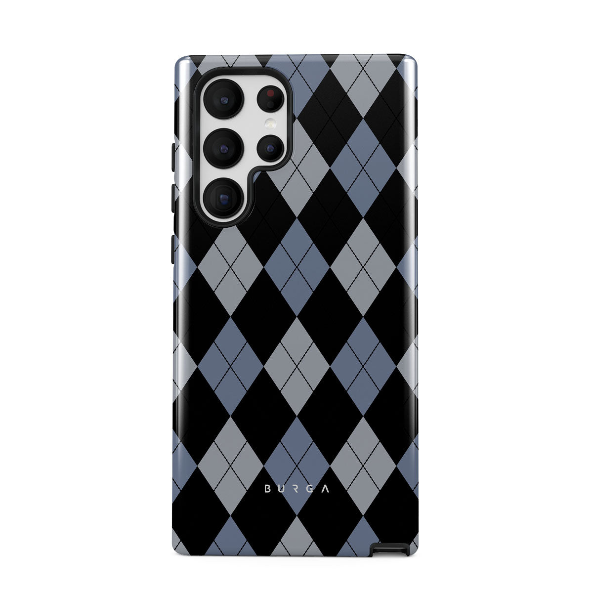 Discover our Trouble Samsung Galaxy S22 Ultra phone case design—a classic argyle pattern featuring stark black diamonds that seamlessly blend with two distinct shades of blue. Made for those who respect the classics but aren't afraid to disrupt the norm.