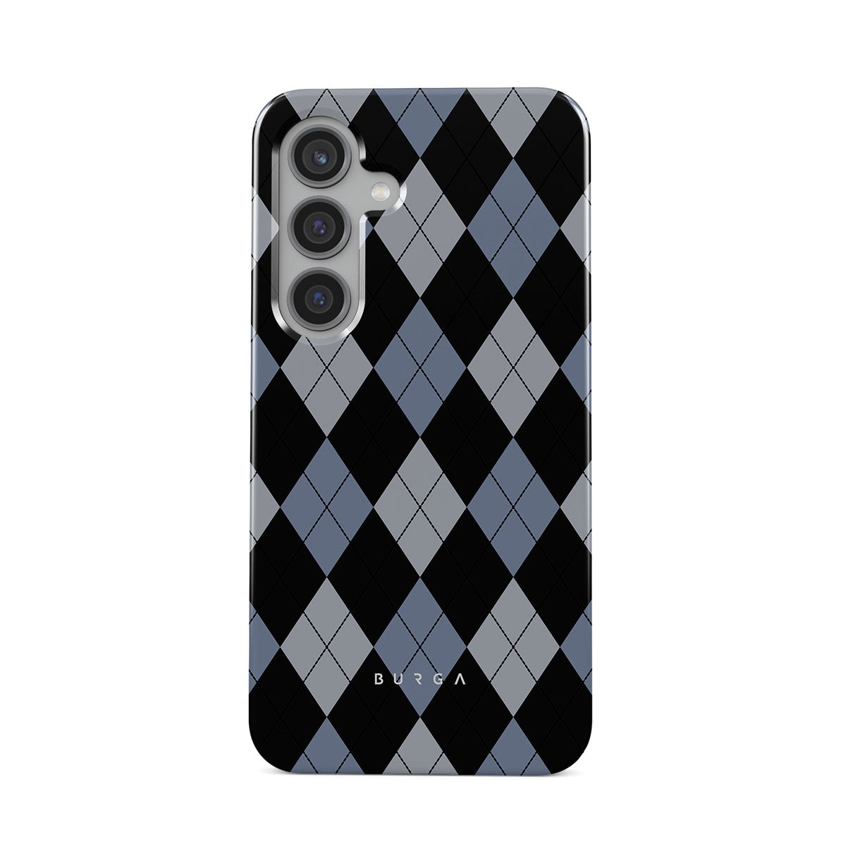 Discover our Trouble Samsung Galaxy S24 phone case design—a classic argyle pattern featuring stark black diamonds that seamlessly blend with two distinct shades of blue. Made for those who respect the classics but aren't afraid to disrupt the norm.