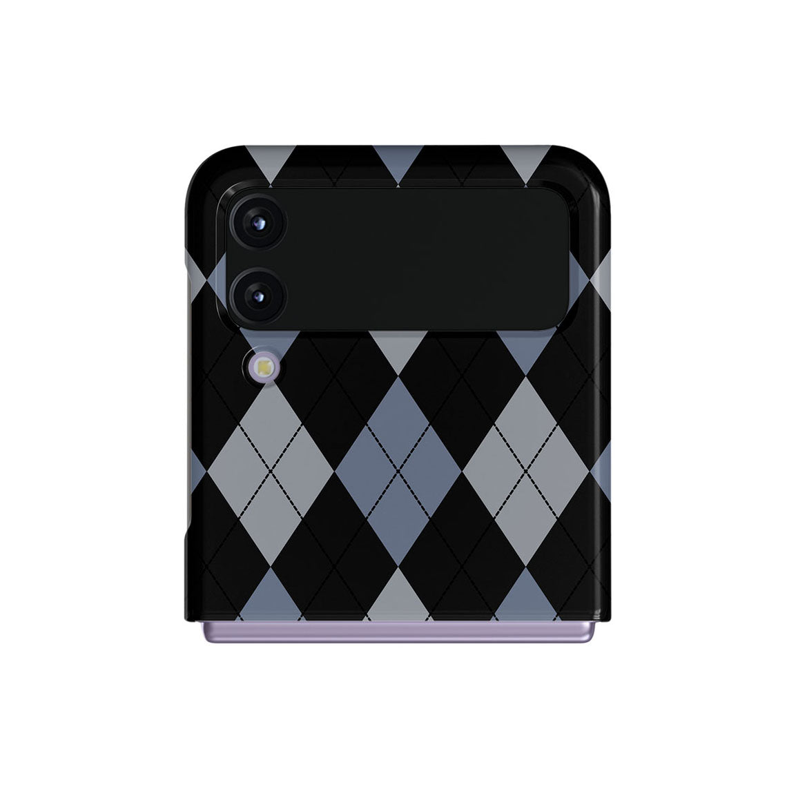 Discover our Trouble Samsung Galaxy Z Flip 4 phone case design—a classic argyle pattern featuring stark black diamonds that seamlessly blend with two distinct shades of blue. Made for those who respect the classics but aren't afraid to disrupt the norm.