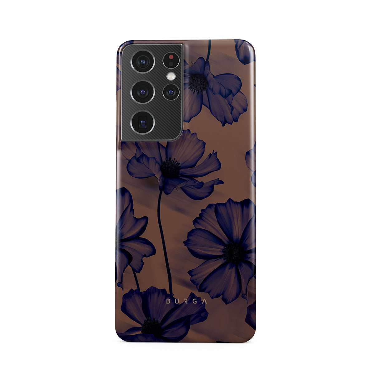 Discover our Velvet Night design. On a soft nude backdrop, blue poppies dance in the untamed rhythm of the wind. A blend of night's peace and daring energy, this Samsung Galaxy S21 Ultra phone case is perfect for those who dream big and seek adventure.