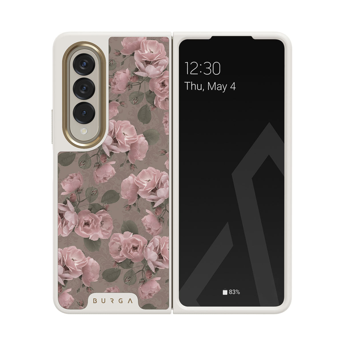 Blush, blooming roses transport you to an era of silent film stars and secret gardens. Our sophisticated Vintage Glamour Samsung Galaxy Z Fold 4 phone case design is perfect for the romantic at heart. It's for those who speak in glances and sighs and find comfort in the nostalgic whispers of floral romance.