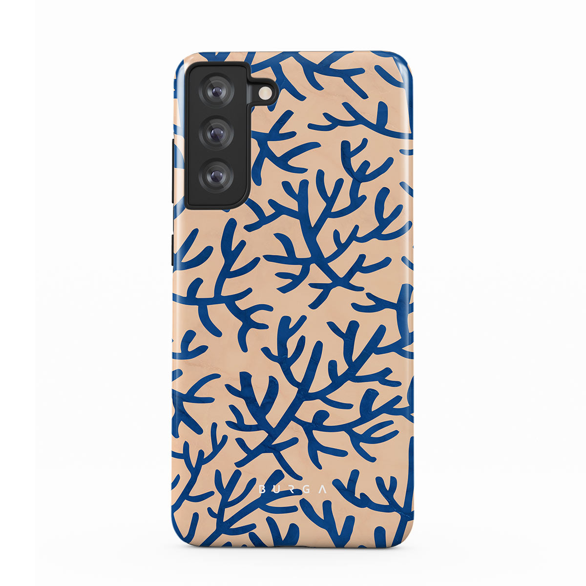 Everyone needs some vitamins and relaxing time by the sea, right? Yes! And our word-play-inspired Vitamin Sea Samsung Galaxy S21 FE phone case design is the perfect companion you must bring to the beach. Keep your phone protected in a case featuring a geometrical tree-like blue pattern. The case will surely catch an eye, and the selfies will look even more popping!