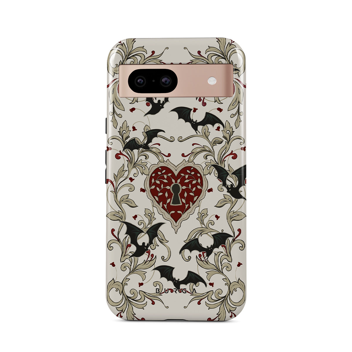 This design features: heart, lock, bats, gothic motifs