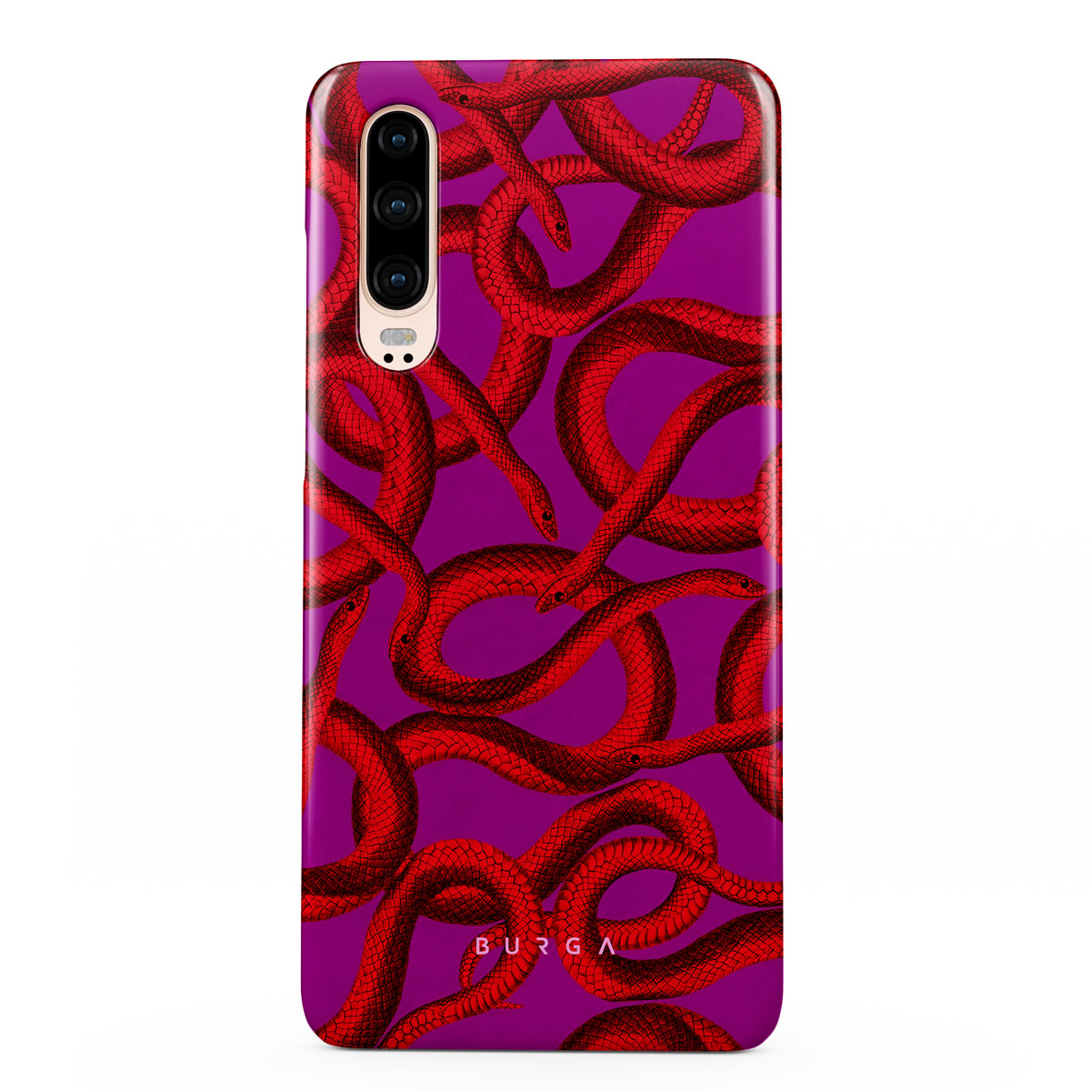 Watch Out Huawei P30 phone case design offers a fierce feel with a bright magenta colored background covered in red snakes pattern. Make a statement while protecting your phone, as this case is guaranteed to catch everyone's eye.