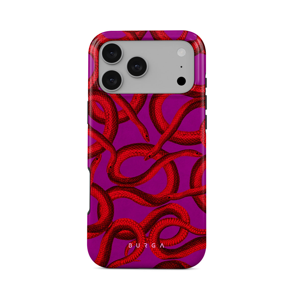 Watch Out iPhone 17 Pro Max phone case design offers a fierce feel with a bright magenta colored background covered in red snakes pattern. Make a statement while protecting your phone, as this case is guaranteed to catch everyone's eye.