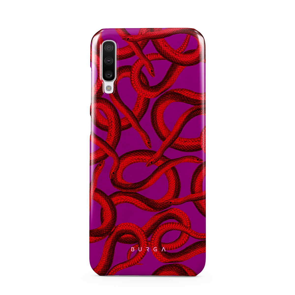 Watch Out Samsung Galaxy A70 phone case design offers a fierce feel with a bright magenta colored background covered in red snakes pattern. Make a statement while protecting your phone, as this case is guaranteed to catch everyone's eye.