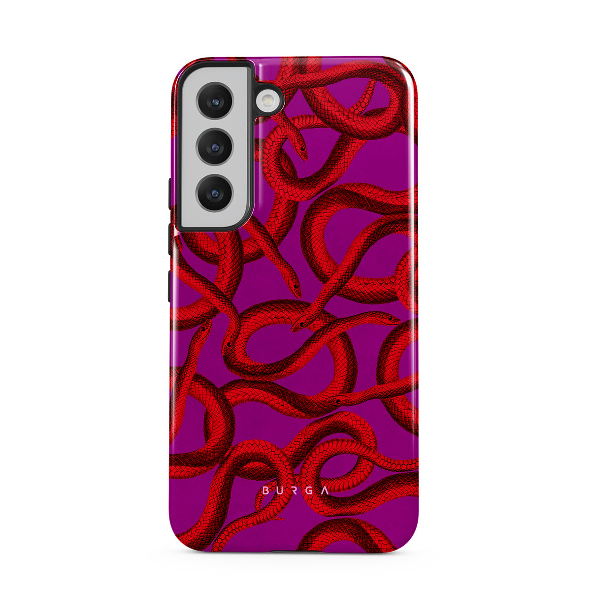 Watch Out Samsung Galaxy S22 Plus phone case design offers a fierce feel with a bright magenta colored background covered in red snakes pattern. Make a statement while protecting your phone, as this case is guaranteed to catch everyone's eye.