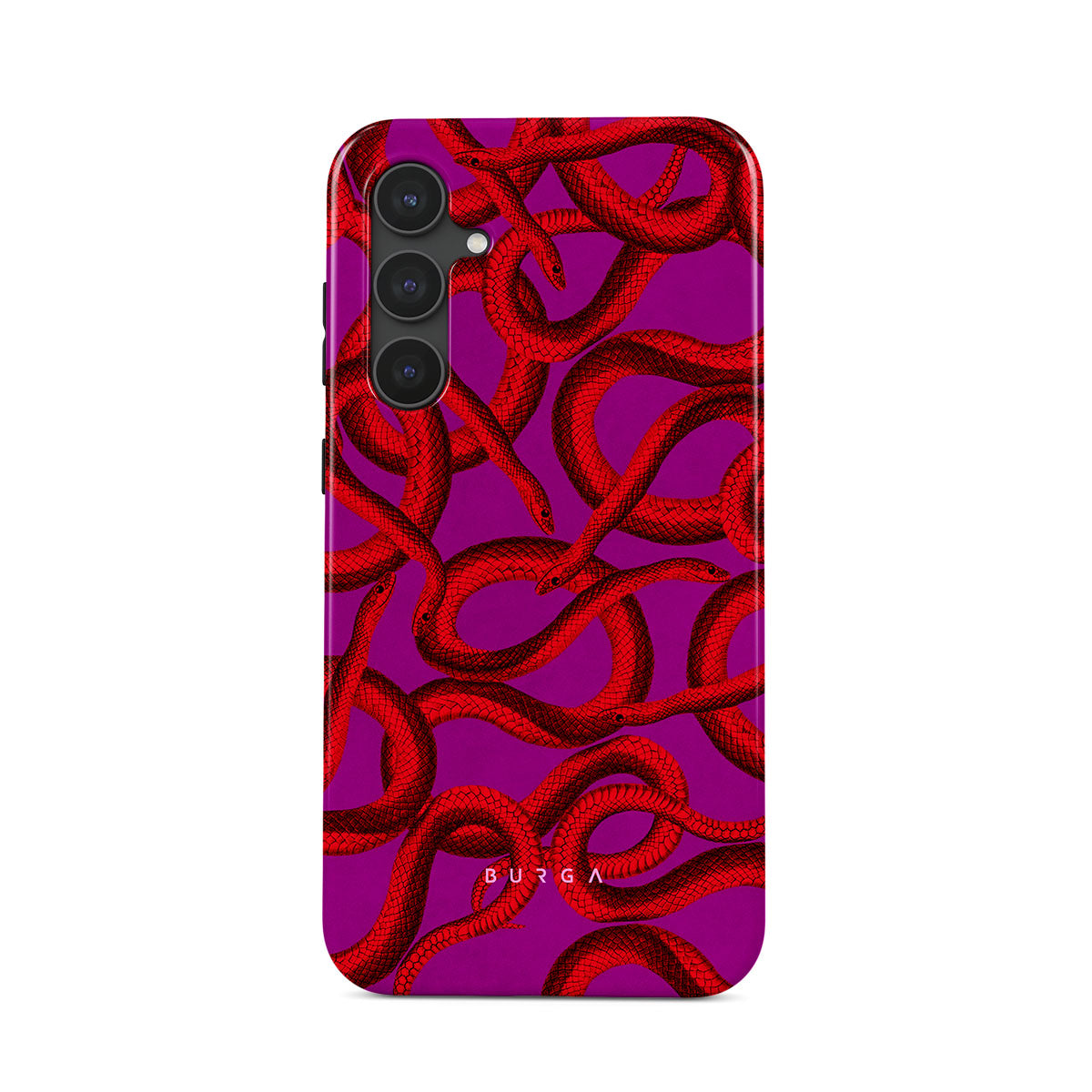 Watch Out Samsung Galaxy S23 FE phone case design offers a fierce feel with a bright magenta colored background covered in red snakes pattern. Make a statement while protecting your phone, as this case is guaranteed to catch everyone's eye.