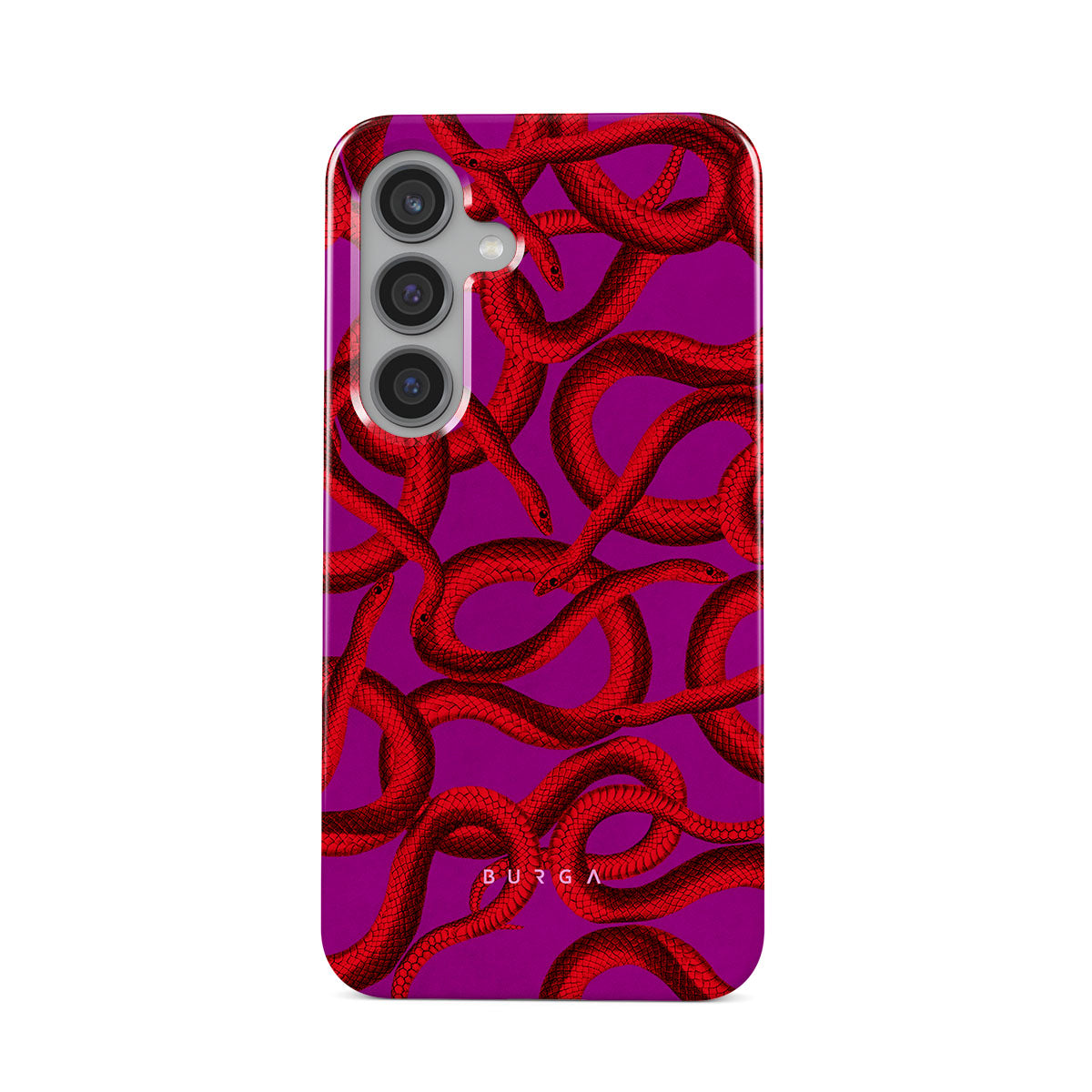 Watch Out Samsung Galaxy S24 FE phone case design offers a fierce feel with a bright magenta colored background covered in red snakes pattern. Make a statement while protecting your phone, as this case is guaranteed to catch everyone's eye.
