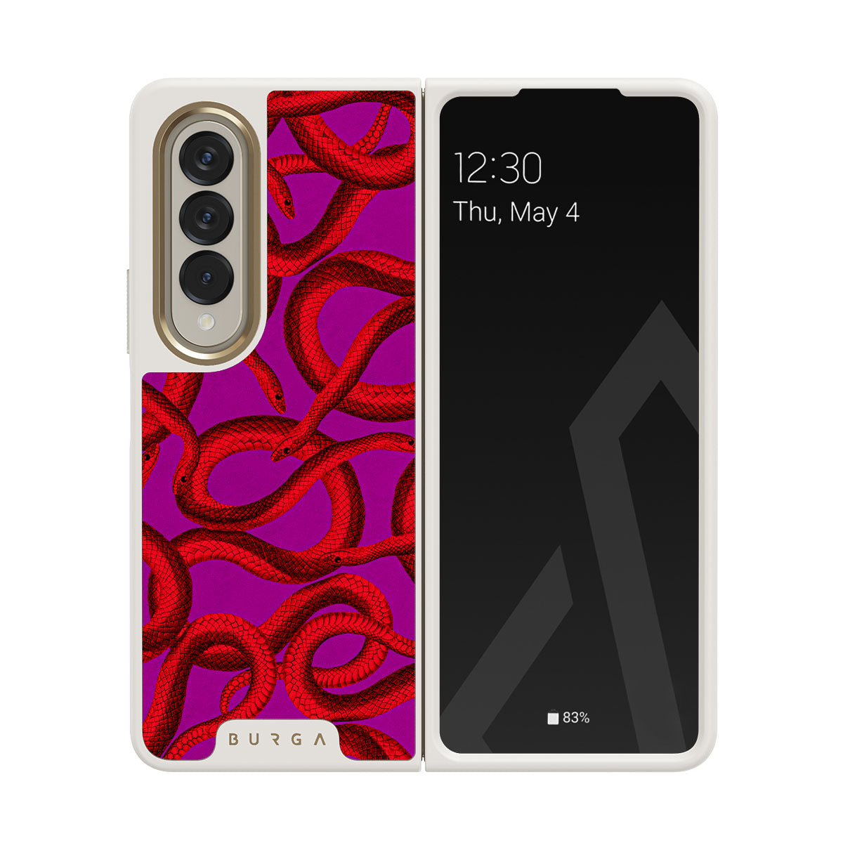 Watch Out Samsung Galaxy Z Fold 4 phone case design offers a fierce feel with a bright magenta colored background covered in red snakes pattern. Make a statement while protecting your phone, as this case is guaranteed to catch everyone's eye.