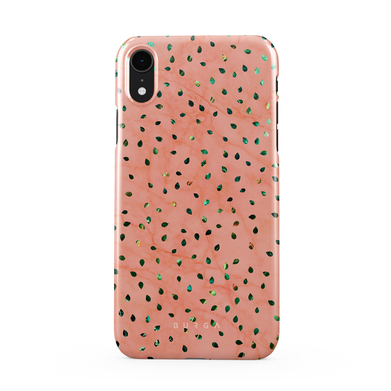 The Watermelon Shake iPhone XR phone case offers a playful take on design merging. The watermelon seed-like specks showcase striking tropical design fragments that add a splash of color to the fresh and breezy coral pink marble. This way, the funny protective phone cover becomes a perfect statement piece for your summer outfits.