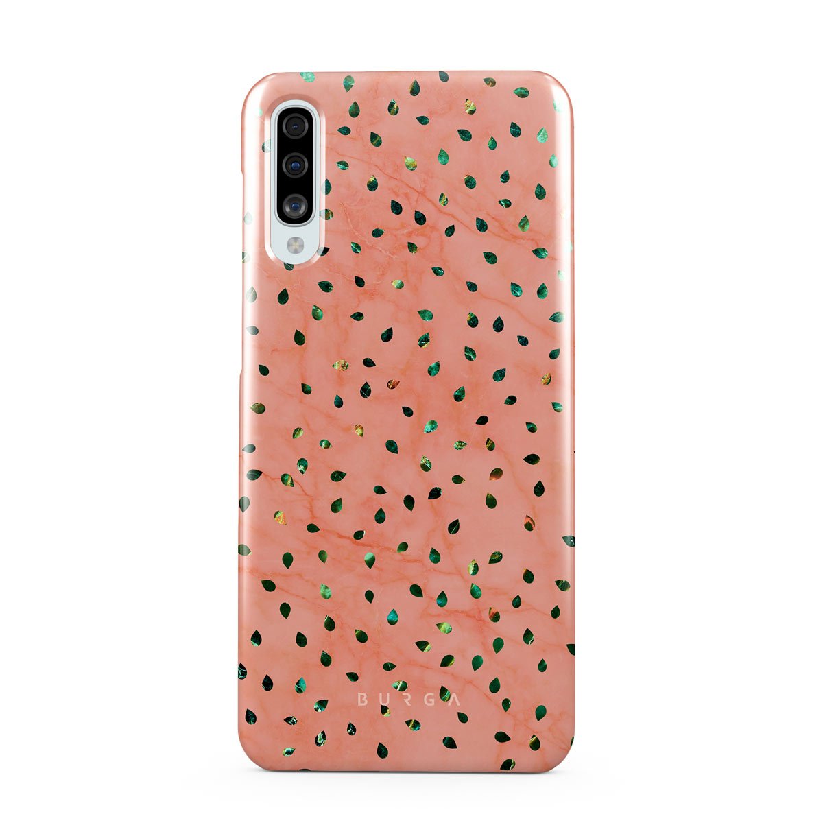 The Watermelon Shake Samsung Galaxy A50 phone case offers a playful take on design merging. The watermelon seed-like specks showcase striking tropical design fragments that add a splash of color to the fresh and breezy coral pink marble. This way, the funny protective phone cover becomes a perfect statement piece for your summer outfits.
