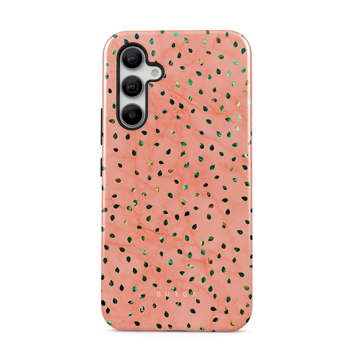 The Watermelon Shake Samsung Galaxy A55 phone case offers a playful take on design merging. The watermelon seed-like specks showcase striking tropical design fragments that add a splash of color to the fresh and breezy coral pink marble. This way, the funny protective phone cover becomes a perfect statement piece for your summer outfits.