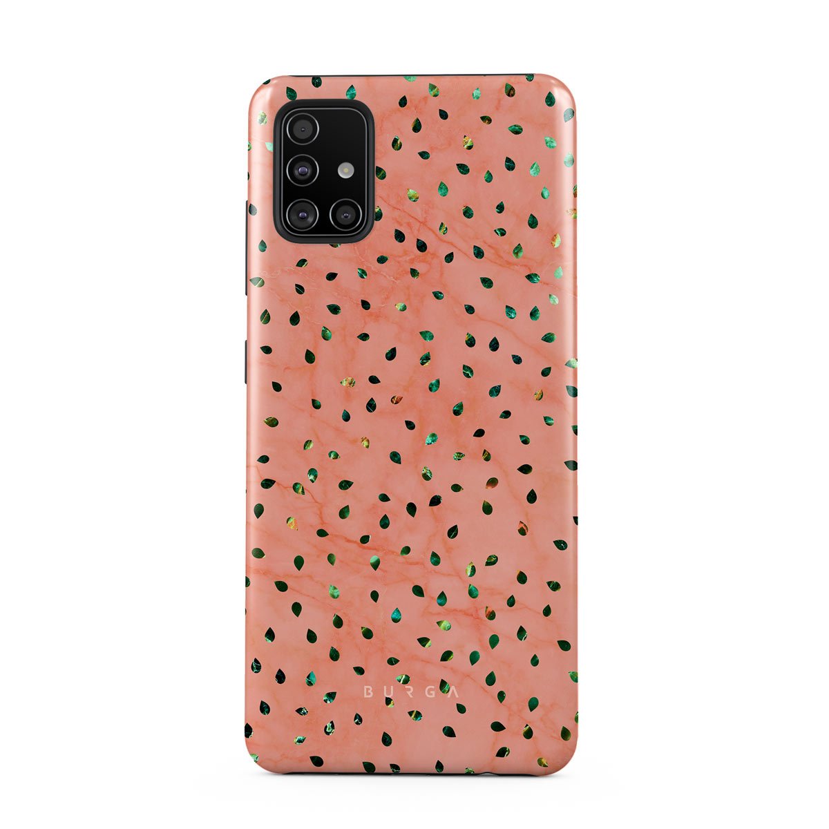 The Watermelon Shake Samsung Galaxy A71 phone case offers a playful take on design merging. The watermelon seed-like specks showcase striking tropical design fragments that add a splash of color to the fresh and breezy coral pink marble. This way, the funny protective phone cover becomes a perfect statement piece for your summer outfits.