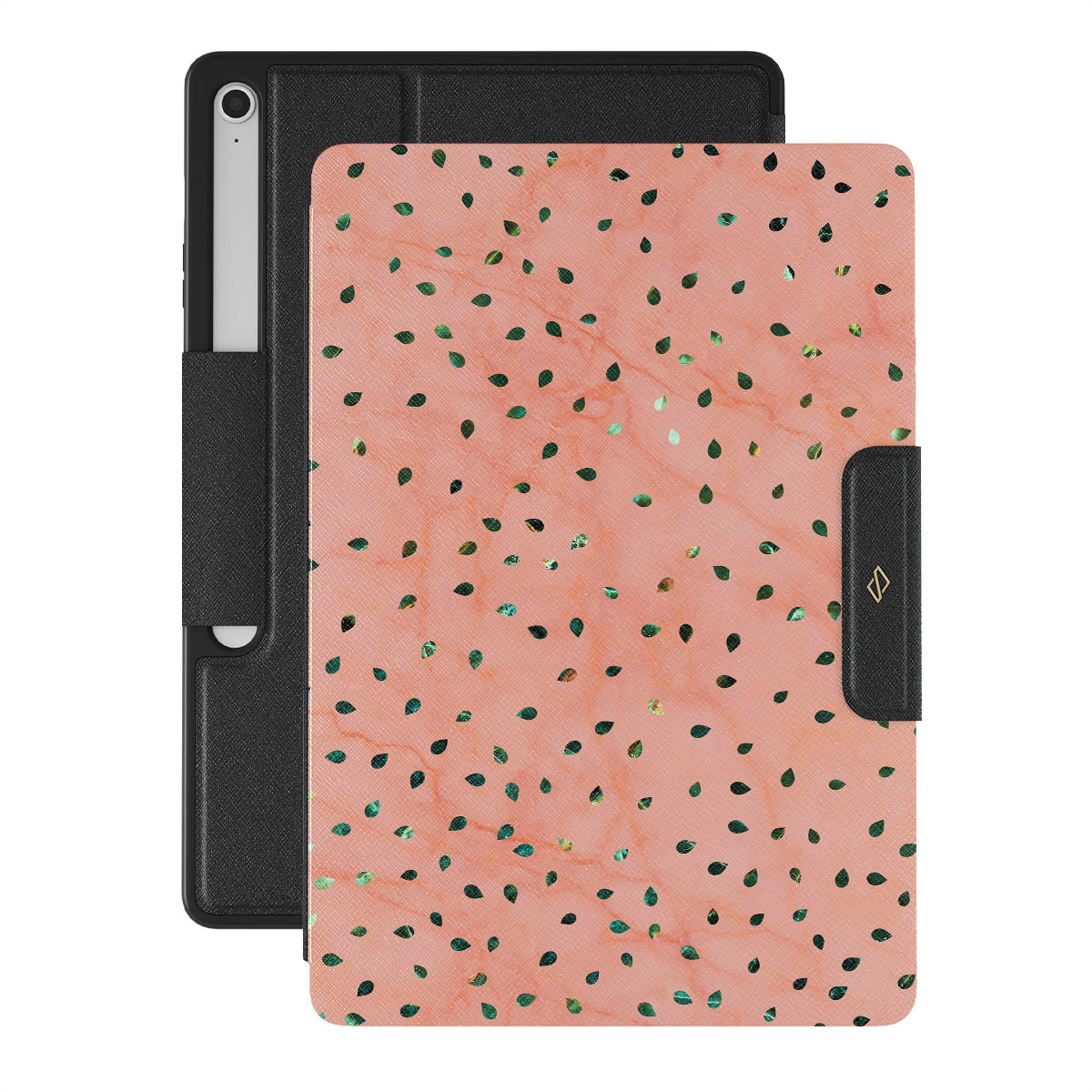 The Watermelon Shake Samsung Galaxy Tab S10+ FE folio case offers a playful take on design merging. The watermelon seed-like specks showcase striking tropical design fragments that add a splash of color to the fresh and breezy coral pink marble. This way, the funny protective Galaxy Tab cover becomes a perfect statement piece for your summer outfits.