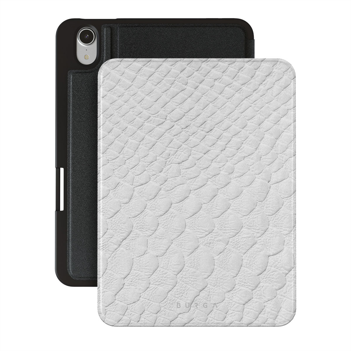 Glacial Desert iPad Mini 8.3 (A17 Pro/6th Gen) 2021 folio case features snakeskin design in glacial white color. The dangerous animal print will add confidence and a touch of luxury to your style while transforming your iPad into a fashion accessory.