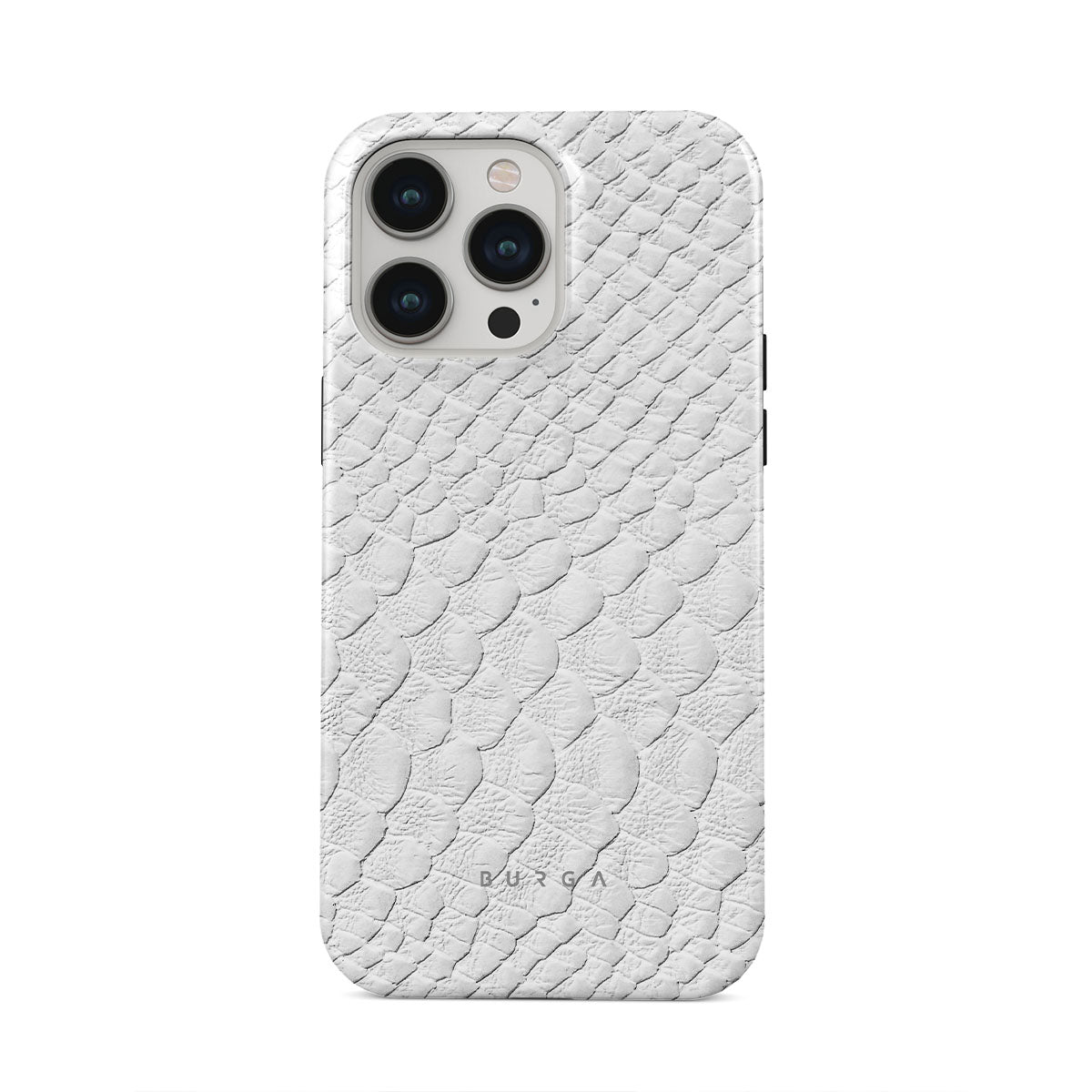 Glacial Desert iPhone 13 Pro phone case features snakeskin design in glacial white color. The dangerous animal print will add confidence and a touch of luxury to your style while transforming your phone into a fashion accessory.