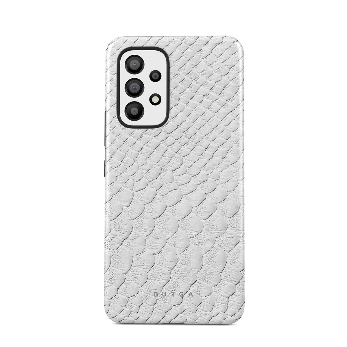 Glacial Desert Samsung Galaxy A72 phone case features snakeskin design in glacial white color. The dangerous animal print will add confidence and a touch of luxury to your style while transforming your phone into a fashion accessory.