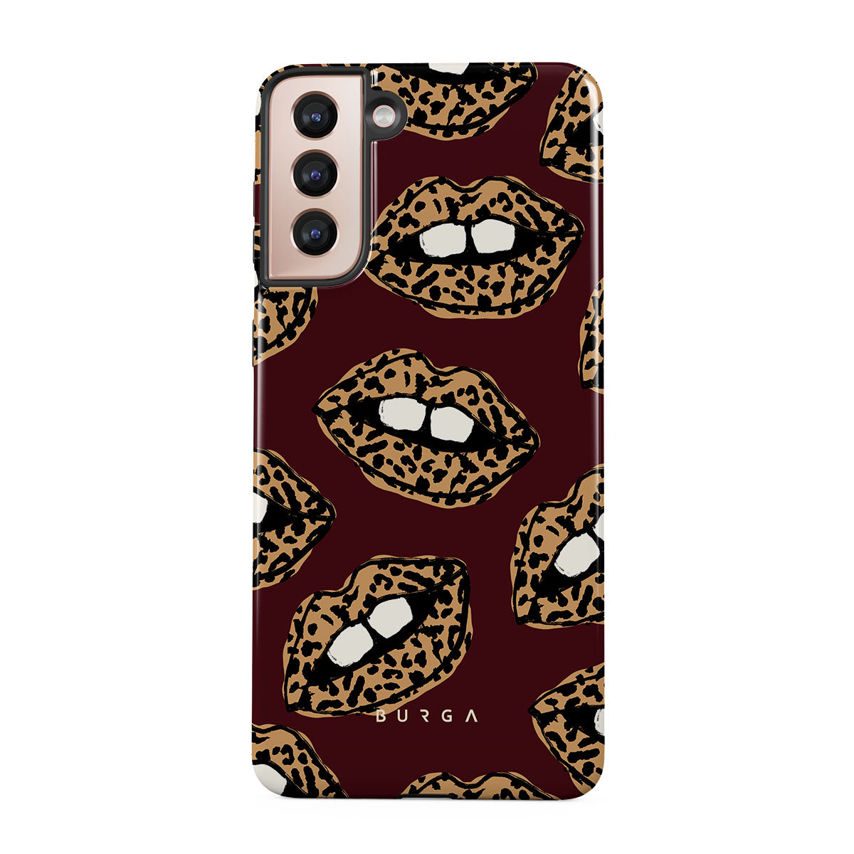 This design features: leopard print, lips, open lips, colored lips