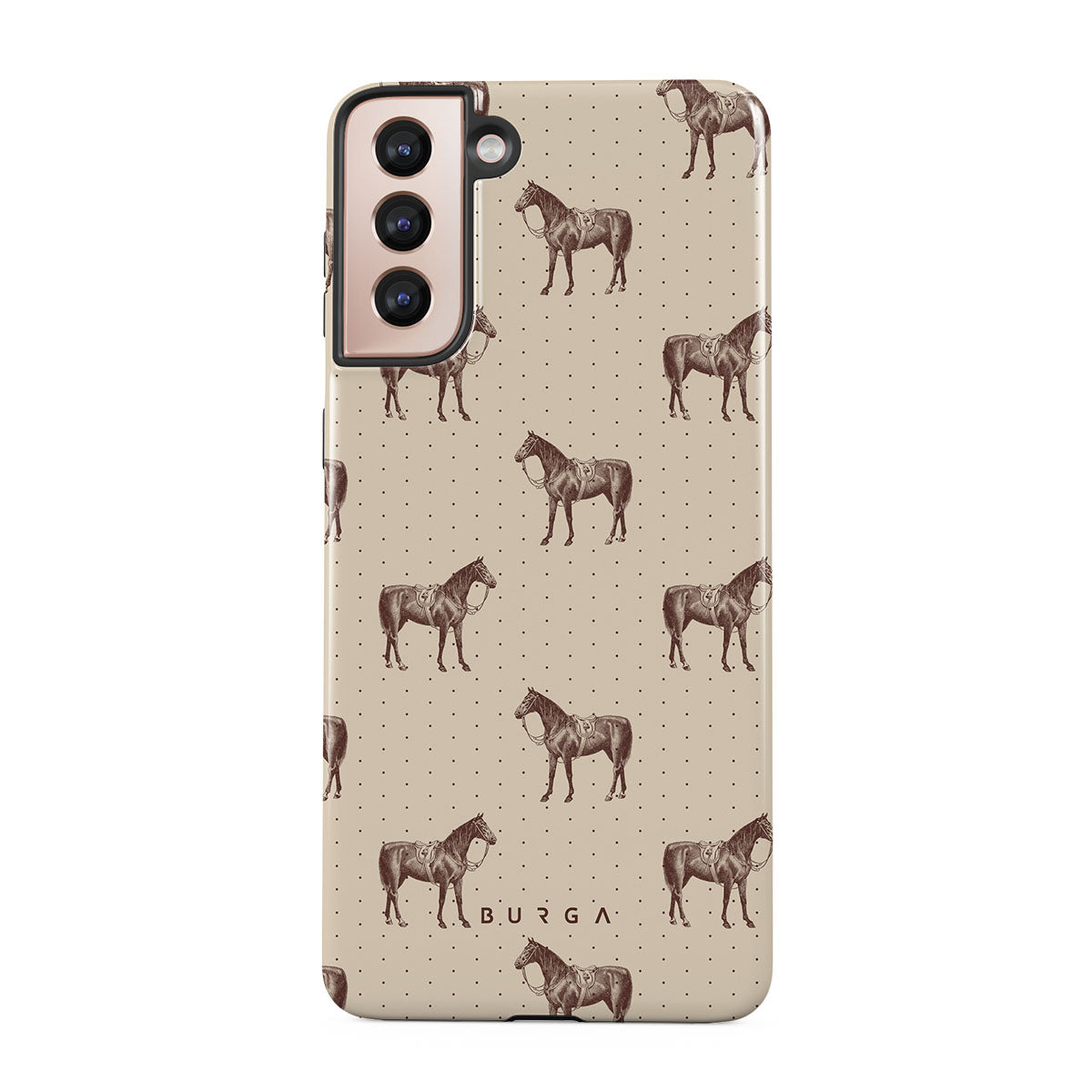 Life might feel like the Wild West sometimes, but your look can still be on point. With beautiful horses on a classic nude background, this Samsung Galaxy S21 Plus phone case design is the one for those who ride free and stylish.