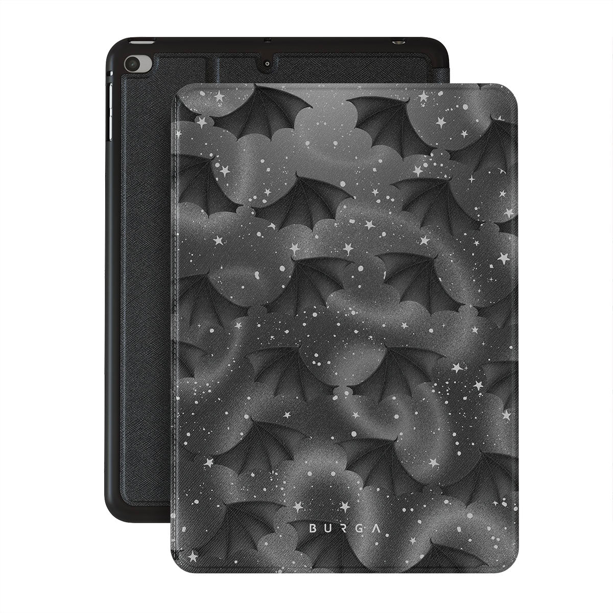This design features: bat wings, stars, mystical swirls, black sky