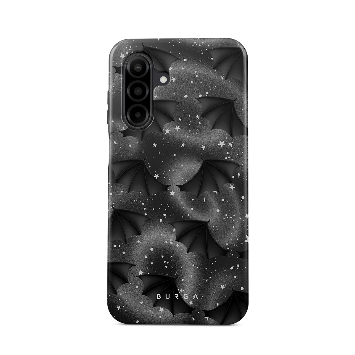 This design features: bat wings, stars, mystical swirls, black sky