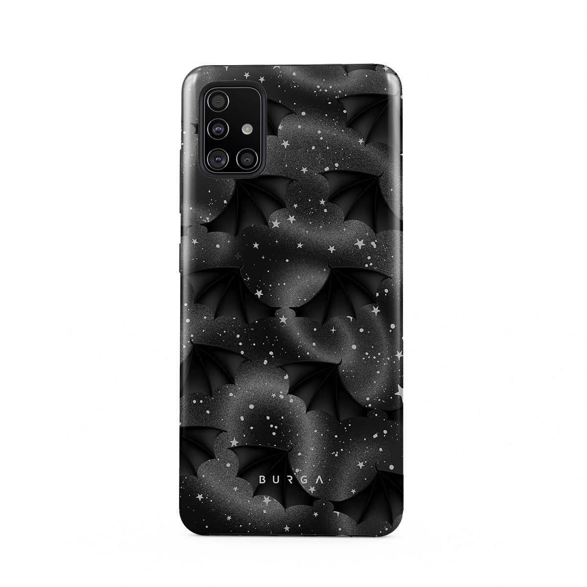 This design features: bat wings, stars, mystical swirls, black sky